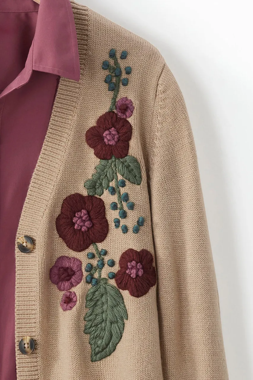Fresh-picked for fall, this cardigan adds a floral note with beautifully embroidered botanicals on the front, plus hand-embroidered French knot accents.