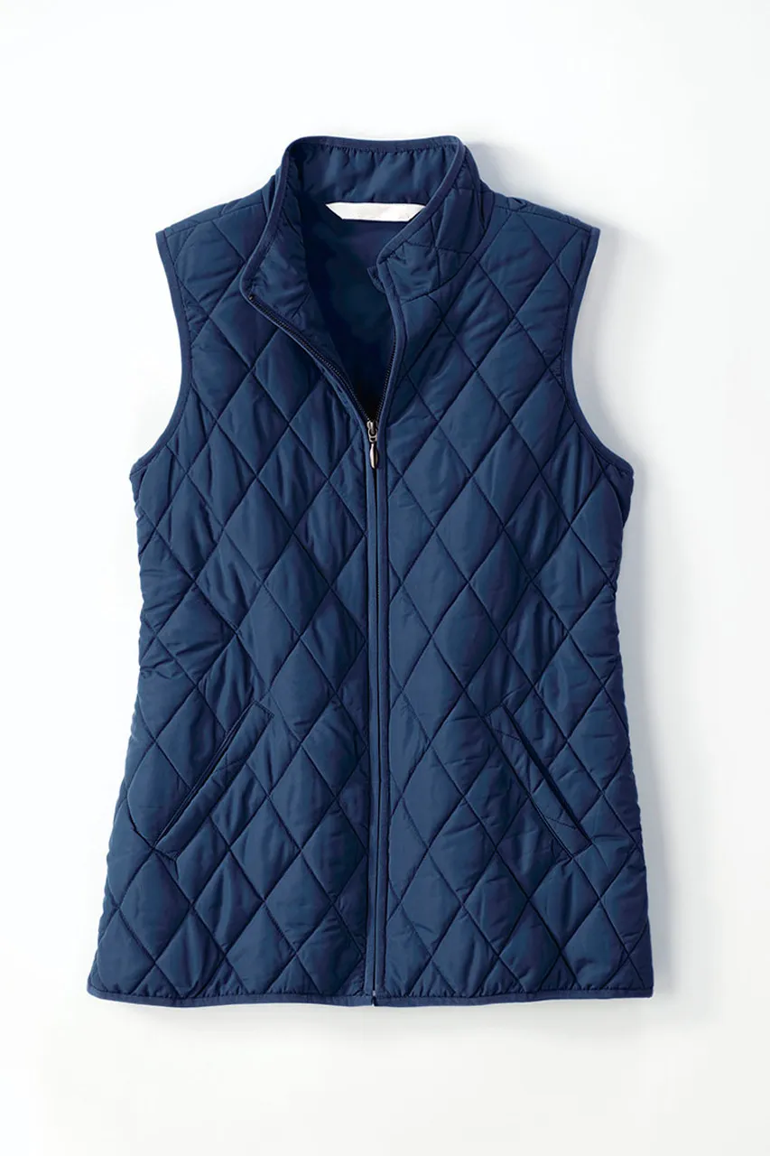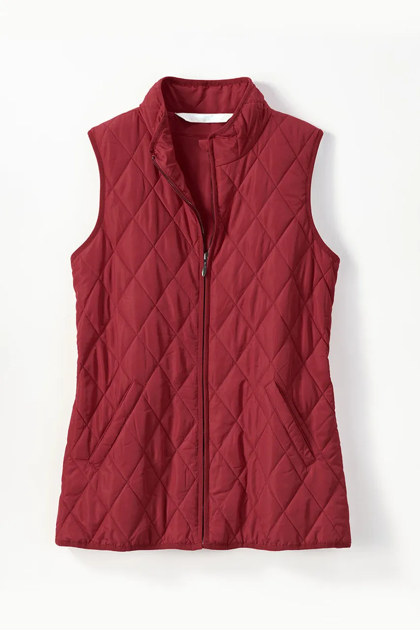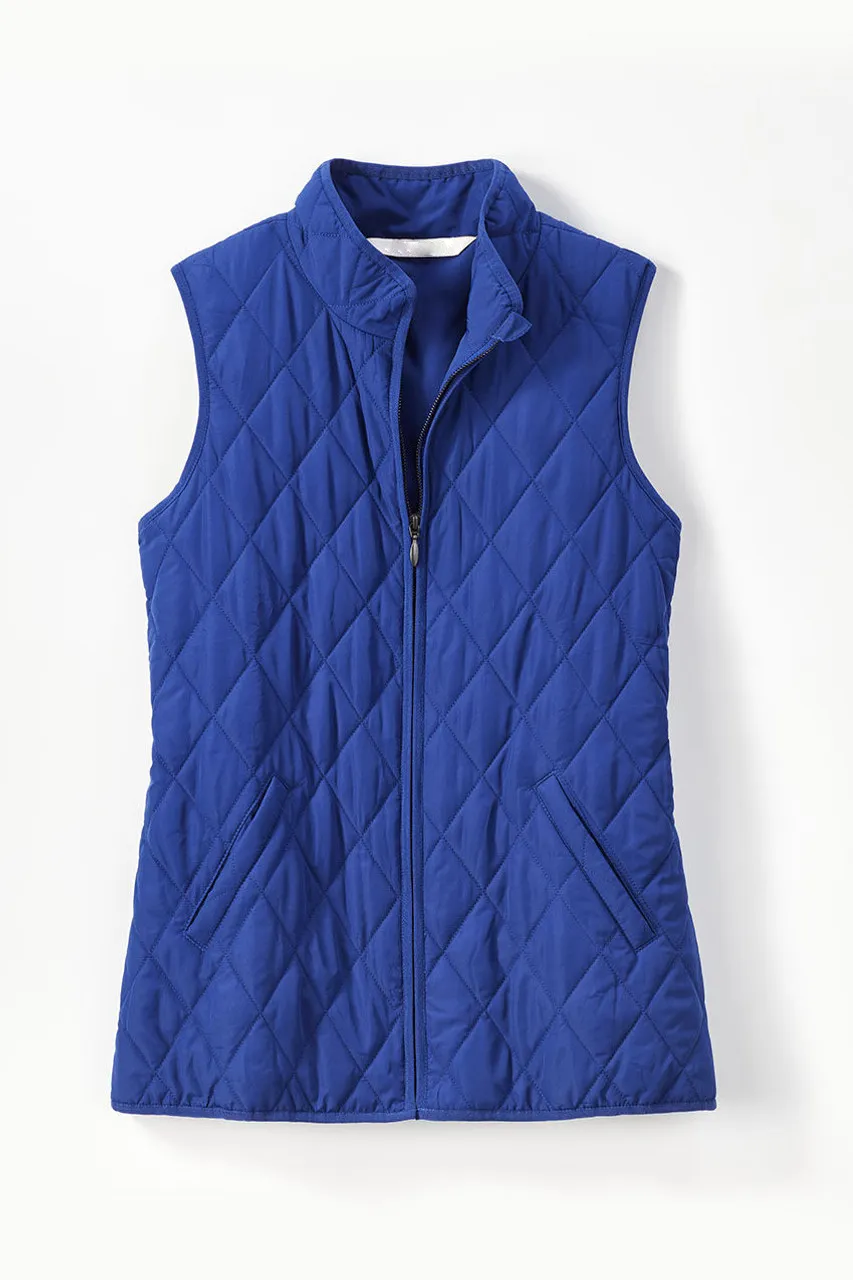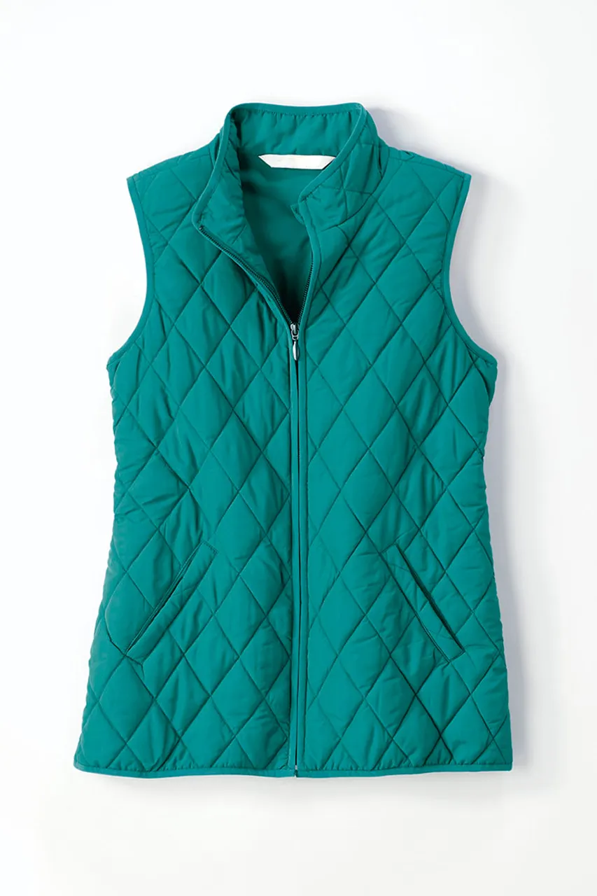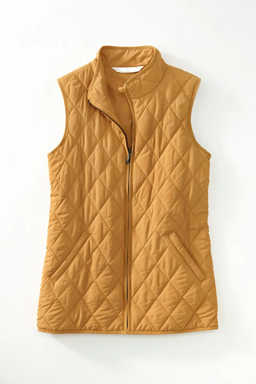 Our lightweight quilted vest is ideal for in-between days or for adding a pop of color – newly updated with a longer length and back elastic to gently shape the waist. Zip front, side pockets plus two inside pockets.