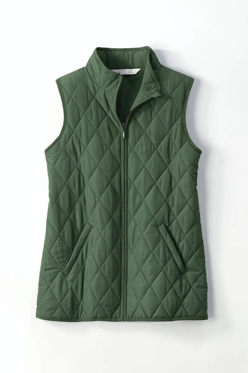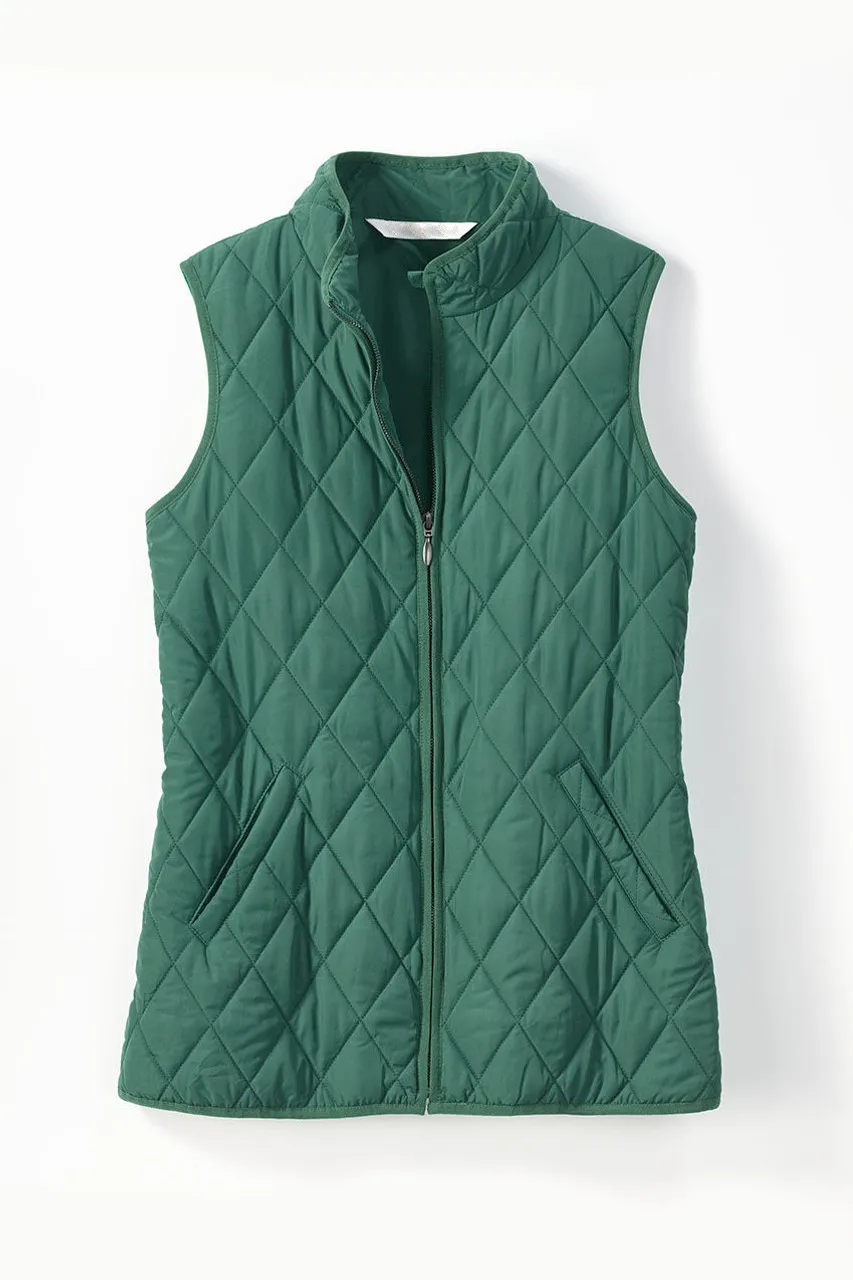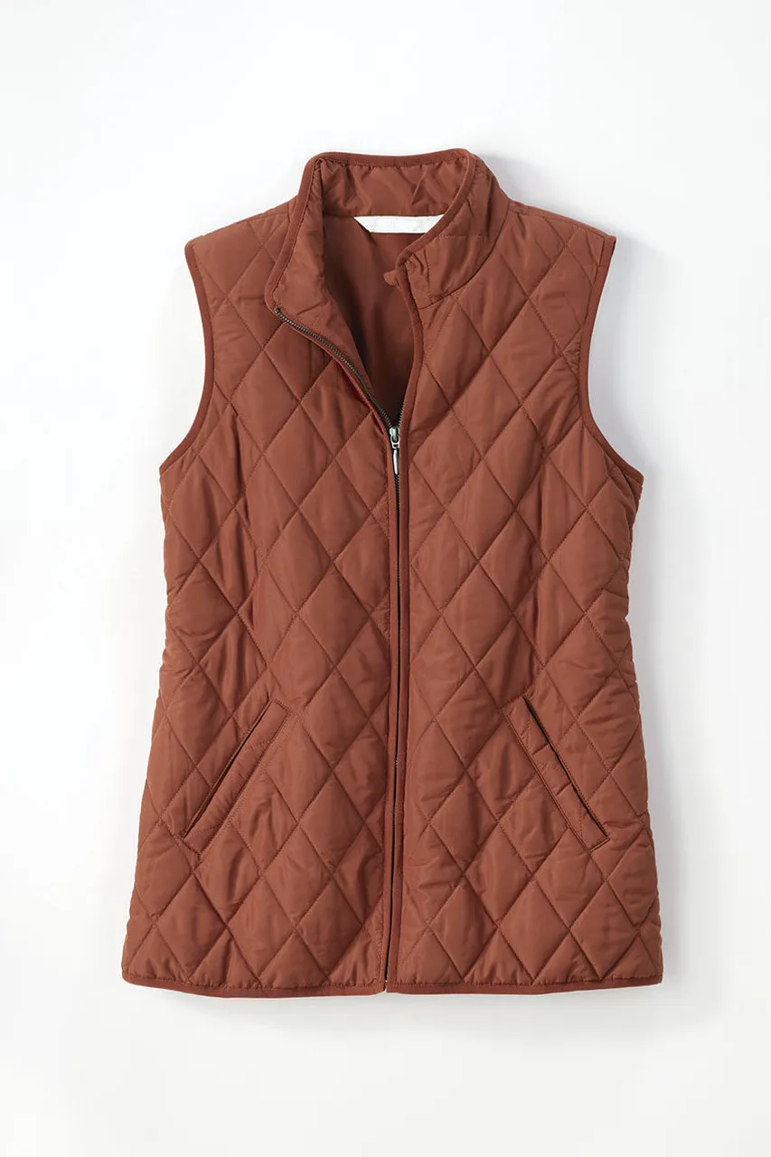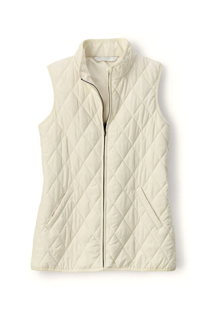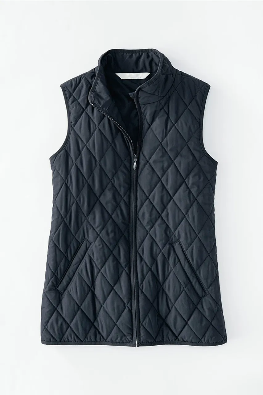 Our lightweight quilted vest is ideal for in-between days or for adding a pop of color – newly updated with a longer length and back elastic to gently shape the waist. Zip front, side pockets plus two inside pockets.