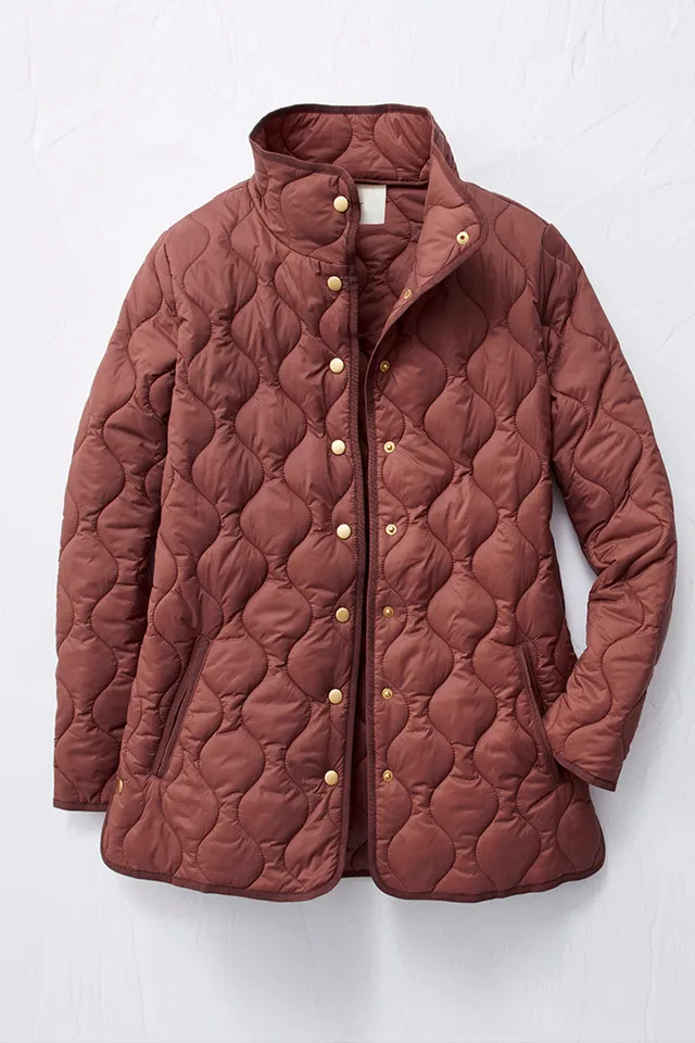 The one-coat wonder for crossing seasons – ultra-lightweight and packable, with a chill-chaser mockneck and full snap front. Side slits have snap closures.